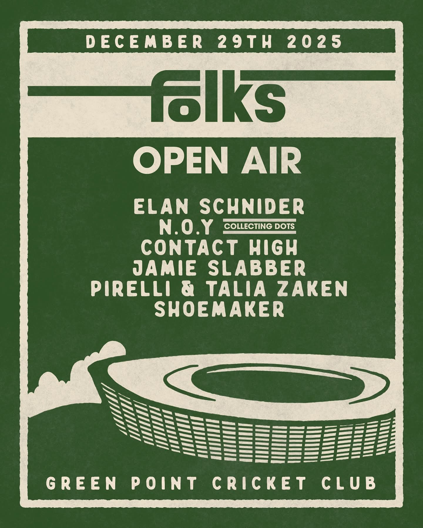 Hosted at the iconic Green Point Cricket Club, Folks Open Air pairs panoramic views, fresh sea breeze, and extravagant production with a carefully curated soundtrack of cutting edge electronic music. From afternoon grooves to golden hour moments, expect a full day of immersive sound, high quality production, and a dancefloor driven by community and connection.