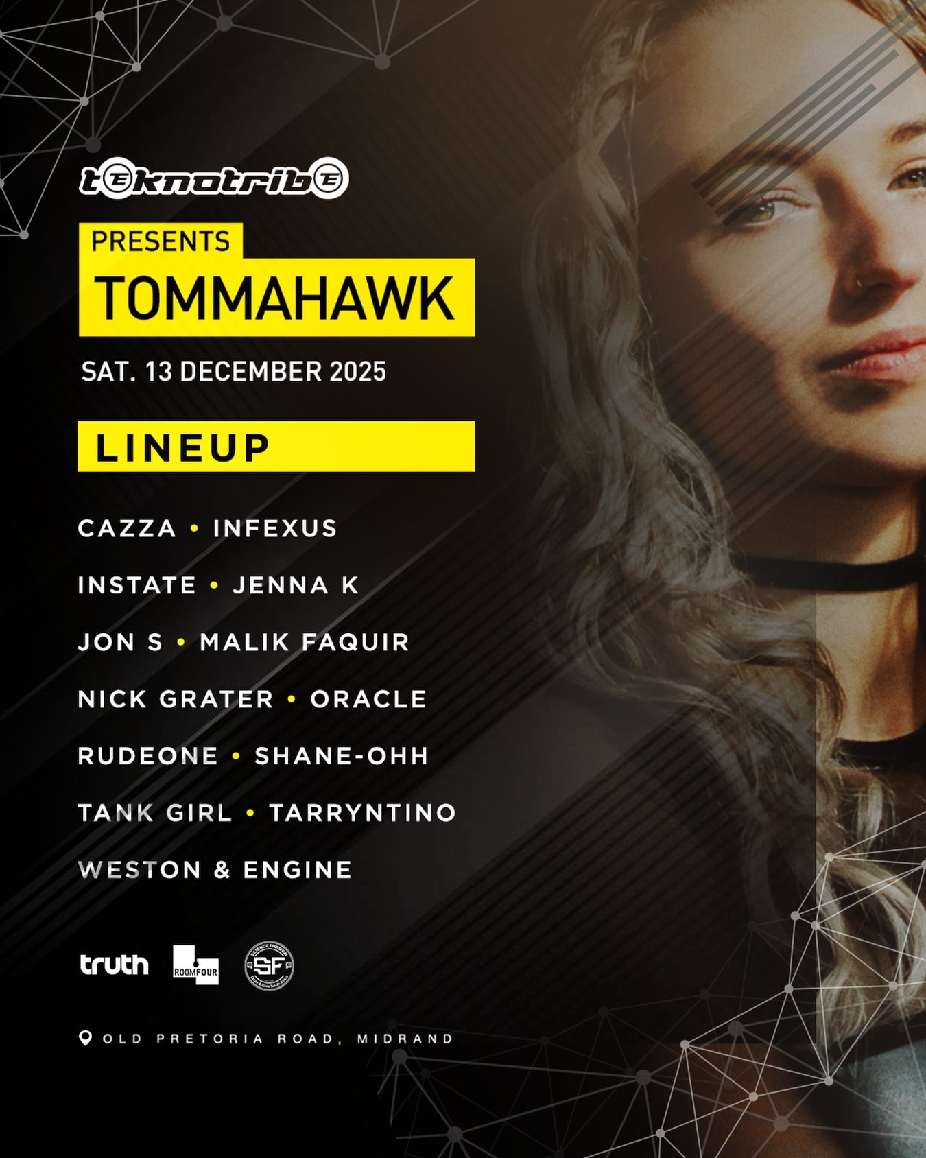 Experience a powerful night of underground electronic music as Teknotribe presents Tommahawk, taking over the legendary Truth Nightclub for the very first time. Known as one of Johannesburgβs most iconic homes of dance music, Truth sets the perfect stage for a high-energy, multi-room journey through techno, drum & bass, and deep, hypnotic minimal sounds. Across three unique dancefloors, Teknotribe delivers an immersive experience tailored for electronic music lovers, techno fans, and festival-goers seeking world-class sound and a night that celebrates the pulse of South Africaβs underground scene.